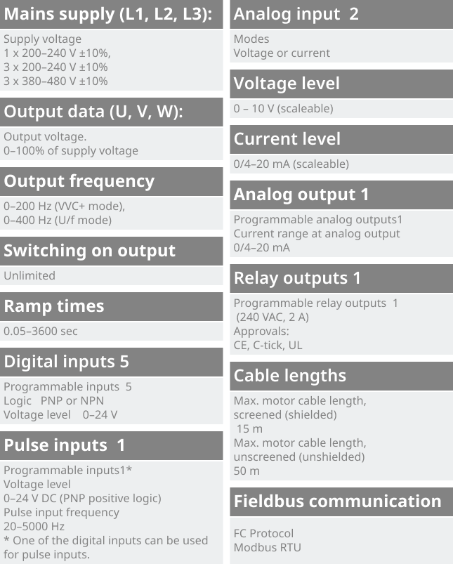 - 3 x 380–480 V AC 0.37–22.0 kW