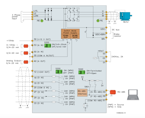 สัญญาณรบกวนวิทยุจากสายมอเตอร์ถูกจำกัดด้วยตัวกรอง RFI ในตัว ซึ่งอนุญาตให้ใช้สายมอเตอร์ยาว 15 ม. (แบบชีล) เป็นไปตามบรรทัดฐานของสหภาพยุโรป