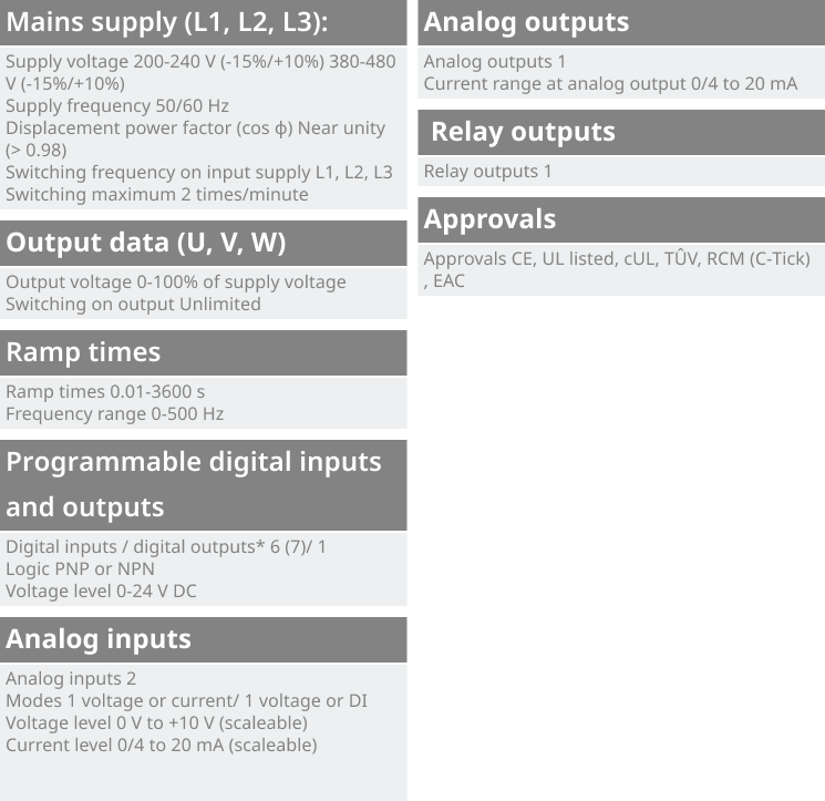- ไม่จำเป็นต้องติดตั้งส่วนประกอบเพิ่มเติมด้วยระบบลด harmonic ในตัว ตัวกรอง RFI ตัวสับเบรก และความปลอดภัยในการทำงาน (STO)